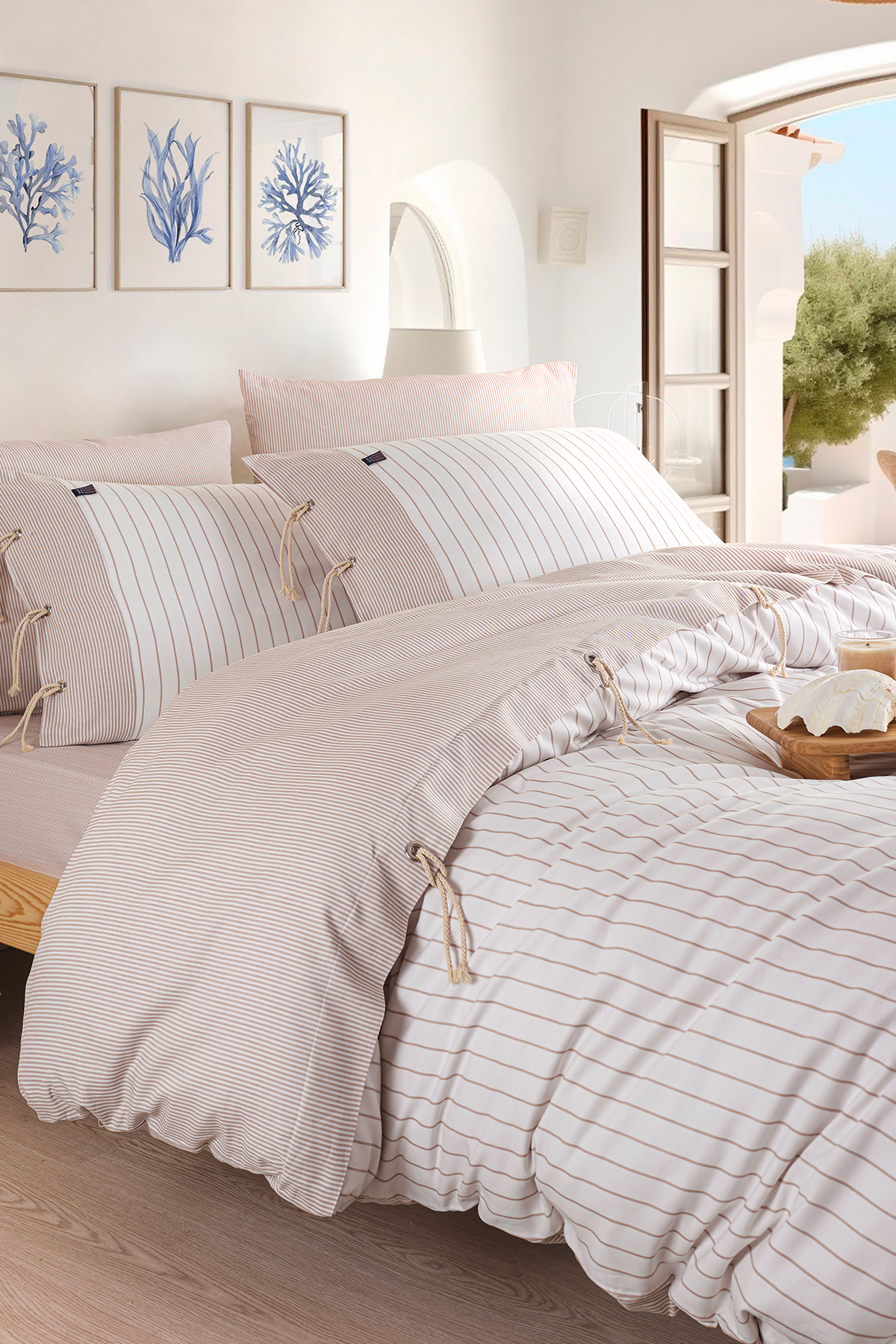 Our new duvet cover set, produced with 100% cotton quality, attracts attention with its eyelet and rope details.